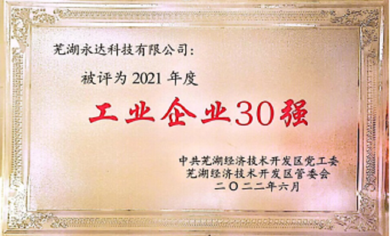 2022年6月9日下午,在蕪湖經(jīng)濟(jì)技術(shù)開發(fā)區(qū)管委會一樓多功能廳,蕪湖永達(dá)科技有限公司在“蕪湖經(jīng)濟(jì)技術(shù)發(fā)開區(qū)2022年度企業(yè)發(fā)展大會”上,榮獲“蕪湖經(jīng)濟(jì)技術(shù)開發(fā)區(qū)2021年度工業(yè)企業(yè)30強(qiáng)”榮譽(yù)稱號。