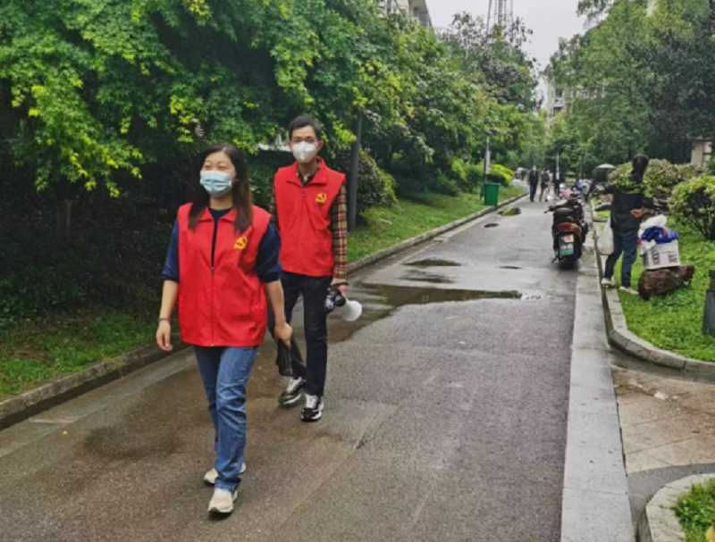 黨員志愿者在社區(qū)內(nèi)巡邏,向社區(qū)居民宣傳疫情防控知識,及時發(fā)現(xiàn)和堵塞防控漏洞。